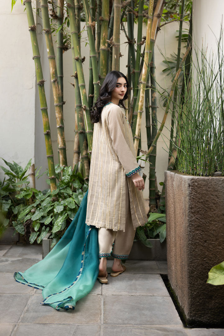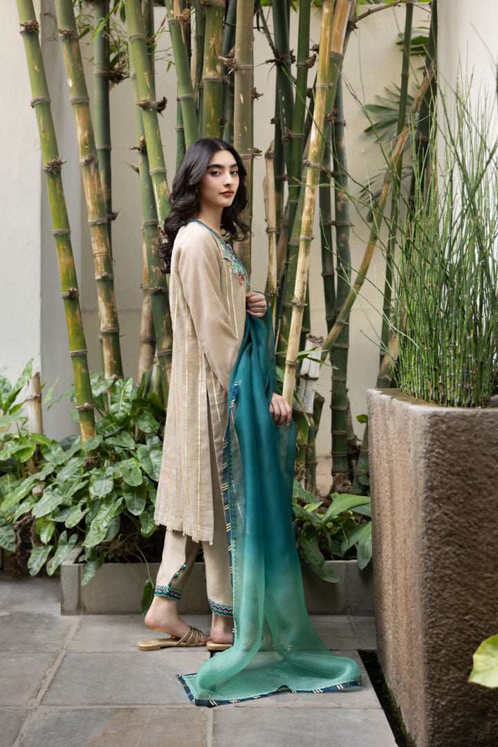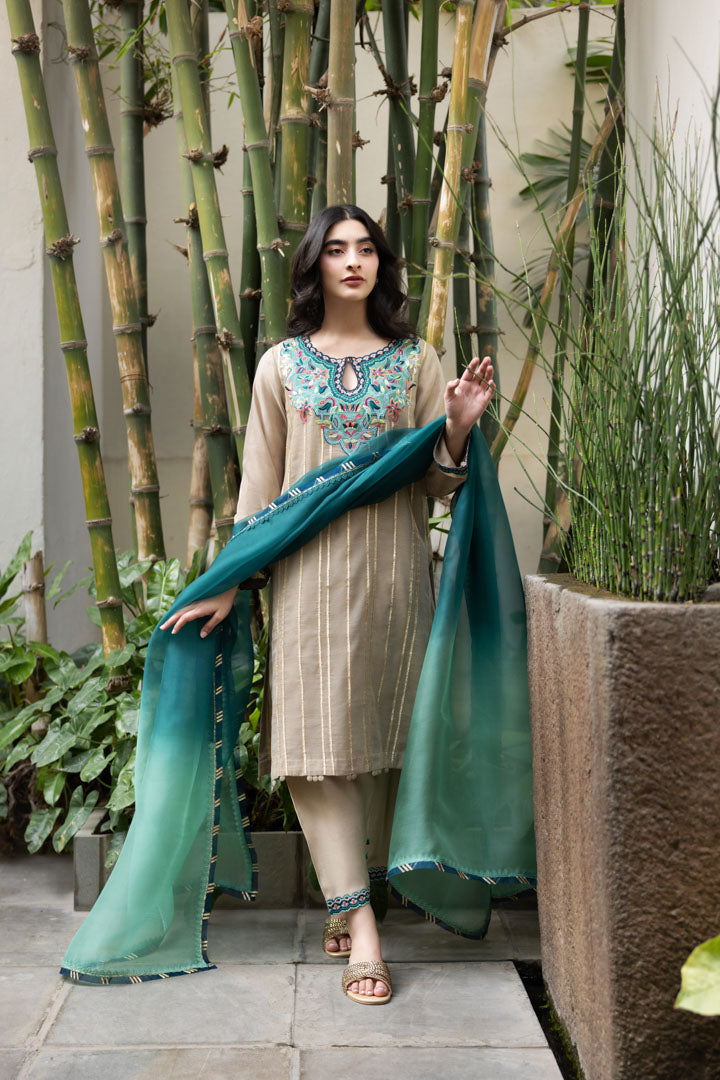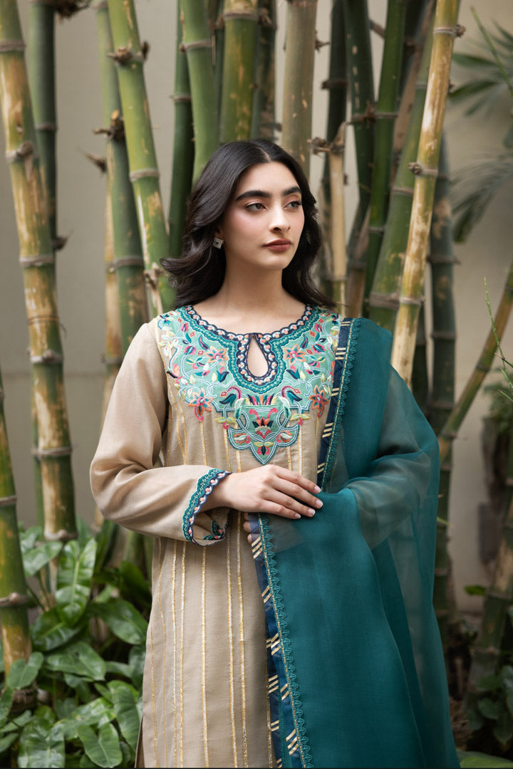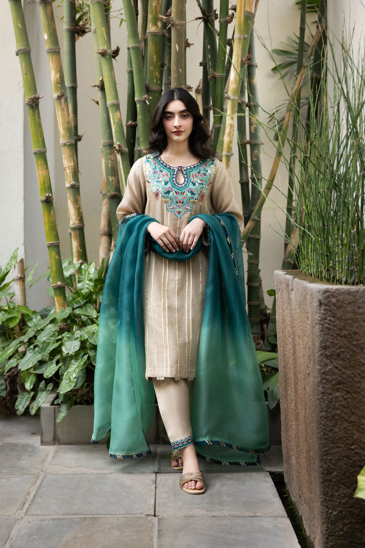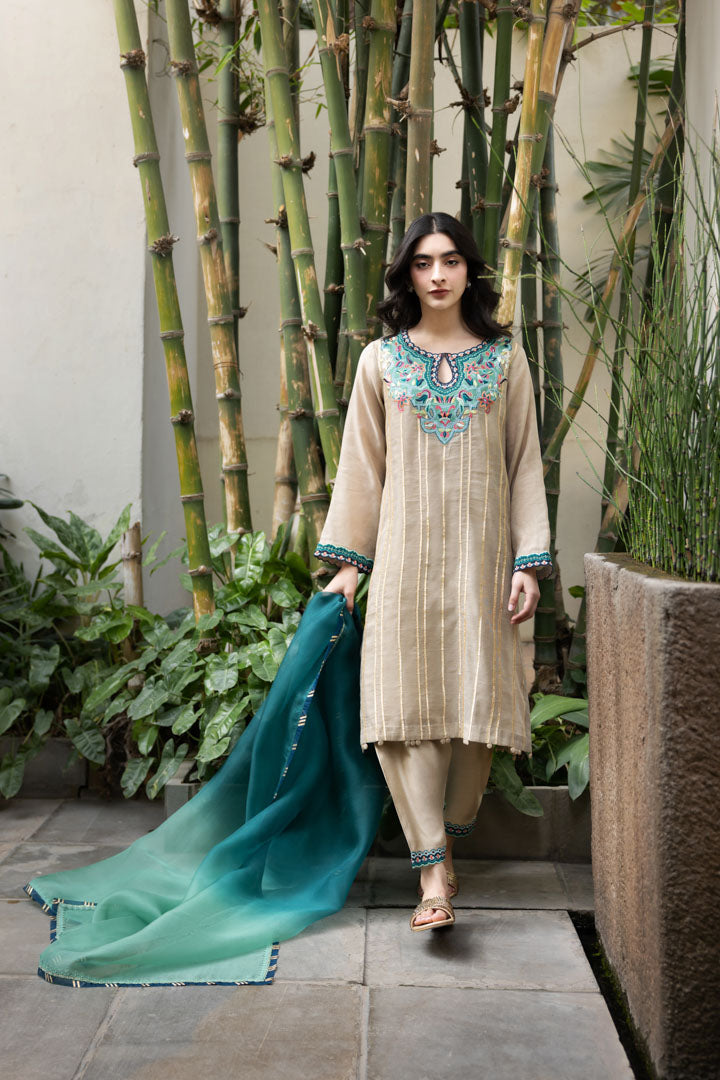 Description: Elegant floral embroidery adorns the shirt, beautifully accentuated with delicate gota lace detailing. The salwar is thoughtfully designed to complement the intricate embroidery, creating a harmonious ensemble. The dupatta completes the look with its exquisite finishing touches, adding a touch of sophistication and grace to the outfit.