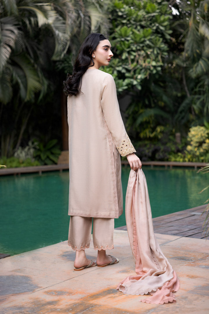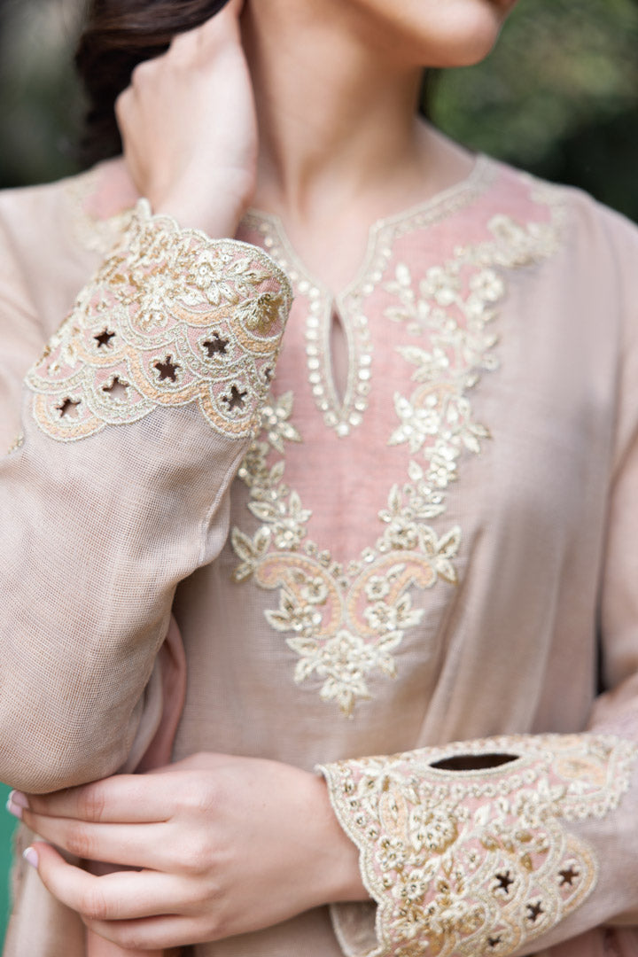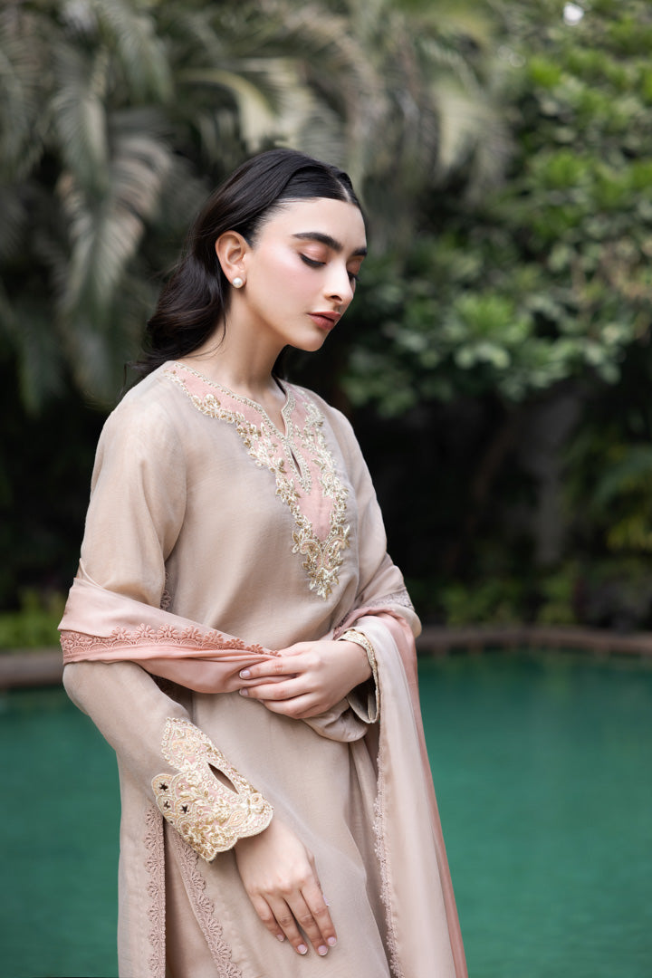 Description: The shirt is adorned with luxurious golden zari thread work, radiating opulence and intricate artistry. The izaar is delicately embroidered, harmonizing seamlessly with the shirt's regal detailing. The dupatta, finished in a stunning two-toned shaded effect, adds depth and sophistication to the ensemble. Together, these elements create a captivating and elegant outfit, blending traditional craftsmanship with contemporary finesse.