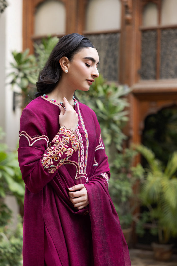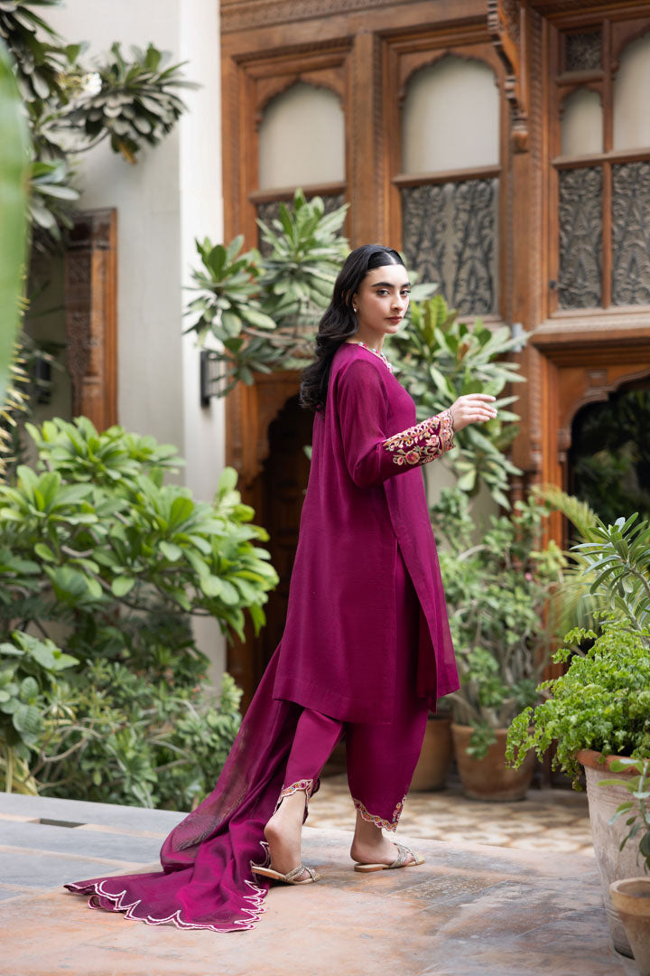 Description: The shirt showcases intricate thread embroidery, highlighting meticulous craftsmanship and exquisite detailing matched with tapered embroidered shalwar. It is complimented with an elegantly designed with a delicate scallop border gracefully framing all four edges, adding a touch of refinement.