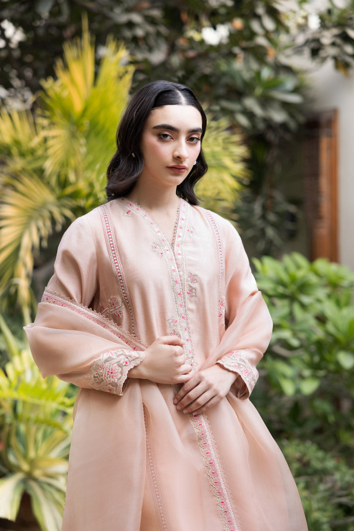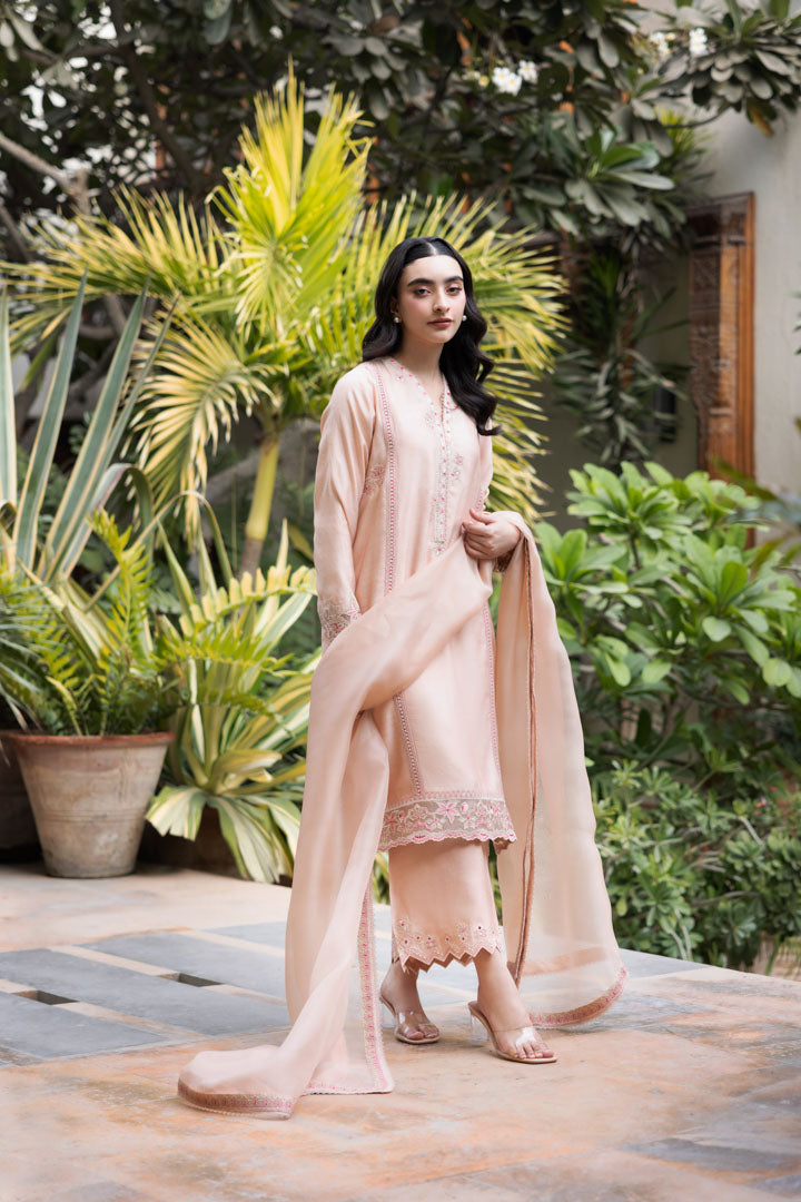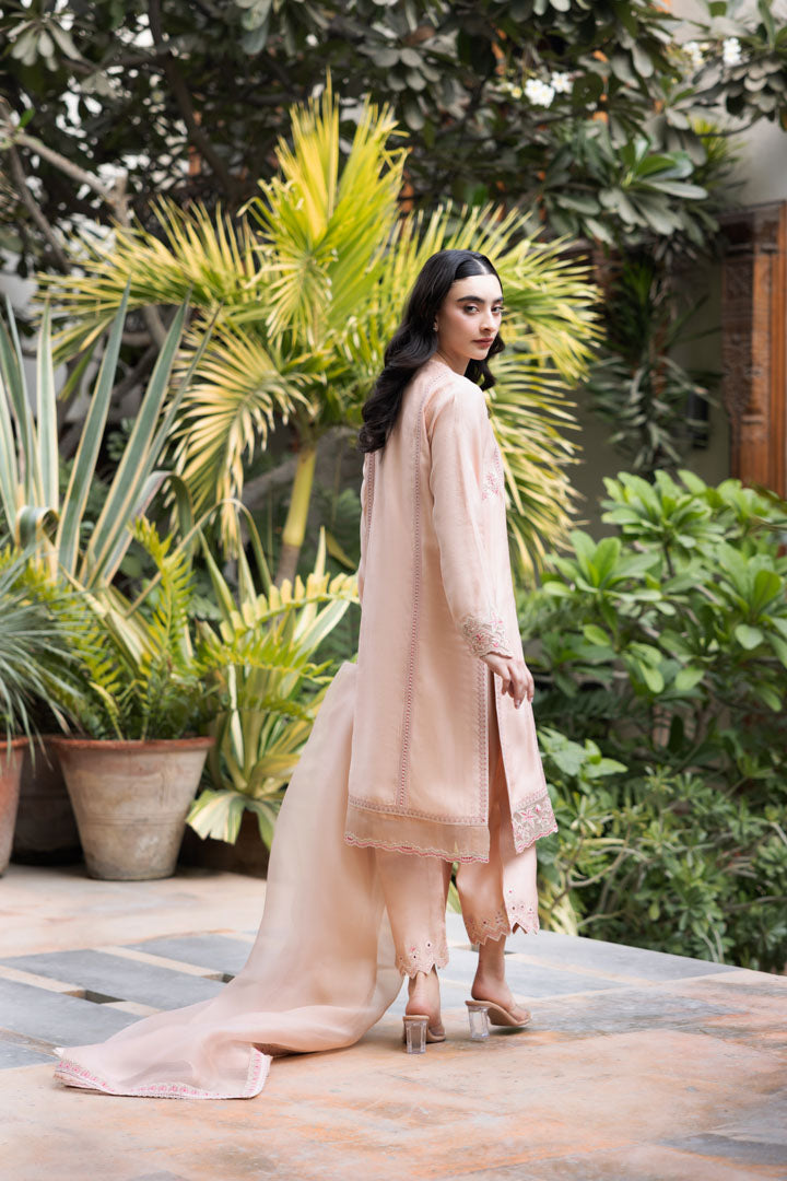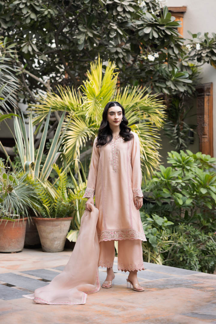 Description: Crafted in a muted blush pink hue, the shirt is adorned with delicate thread embroidery, exuding understated elegance and intricate artistry. The izaar features exquisite embroidered cutwork, adding a refined and textured charm. The dupatta is beautifully embellished with intricate thread work embroidery along all four borders, completing the ensemble with a touch of sophistication.