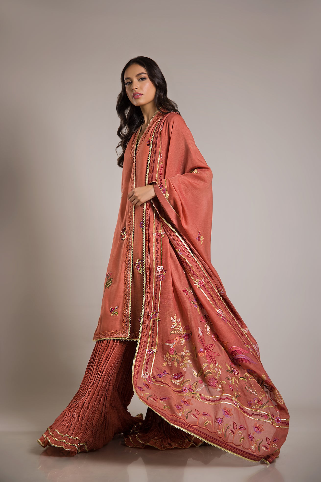 This classic Dhaka pajama is crafted from crushed fabric and finished with beautiful Gota and side tassels for an elegant touch. Sold separately, it's sure to complete any style. Can be viewed in bottom section.